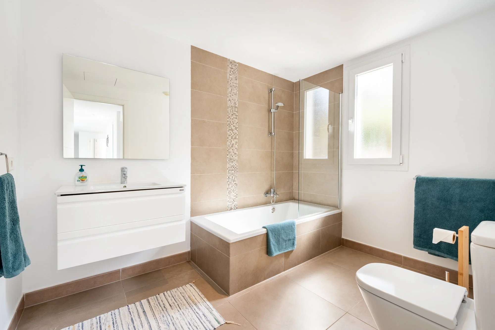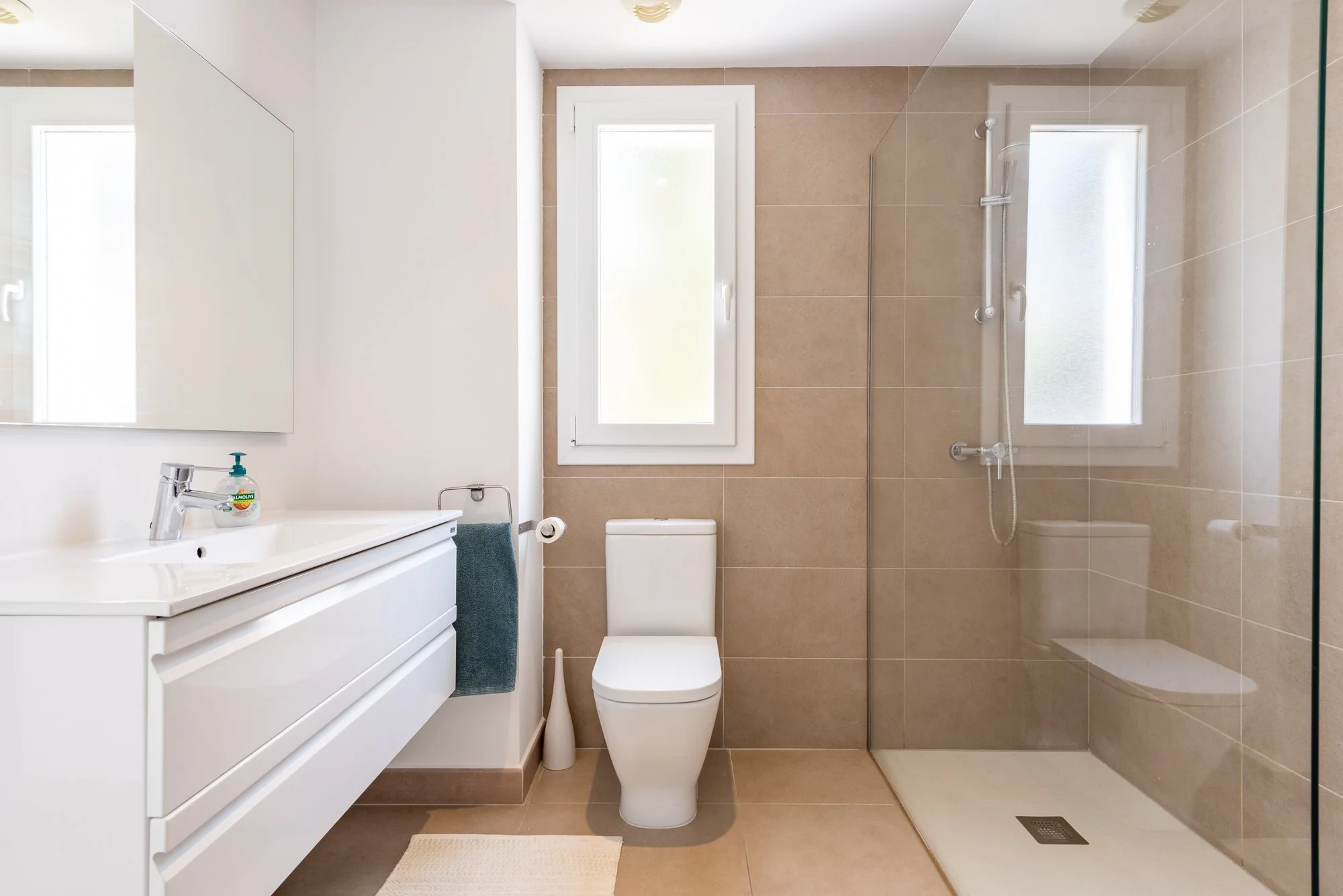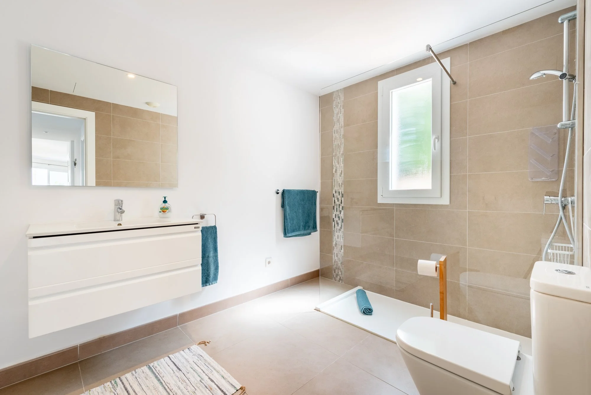 Beautiful master bedroom with ensuite bathroom and shower. Wake up in the morning to glorious views of Cala d’Or Estuary.